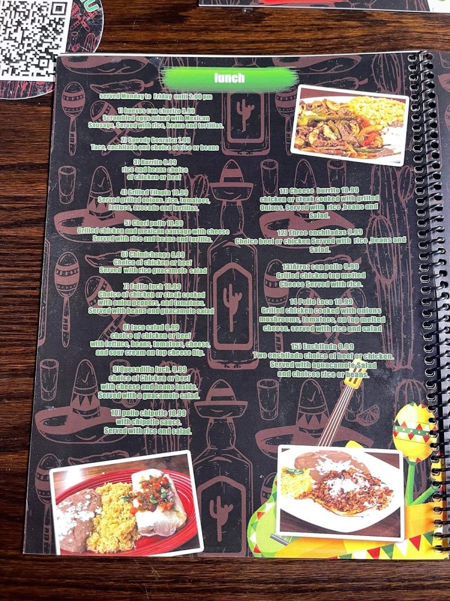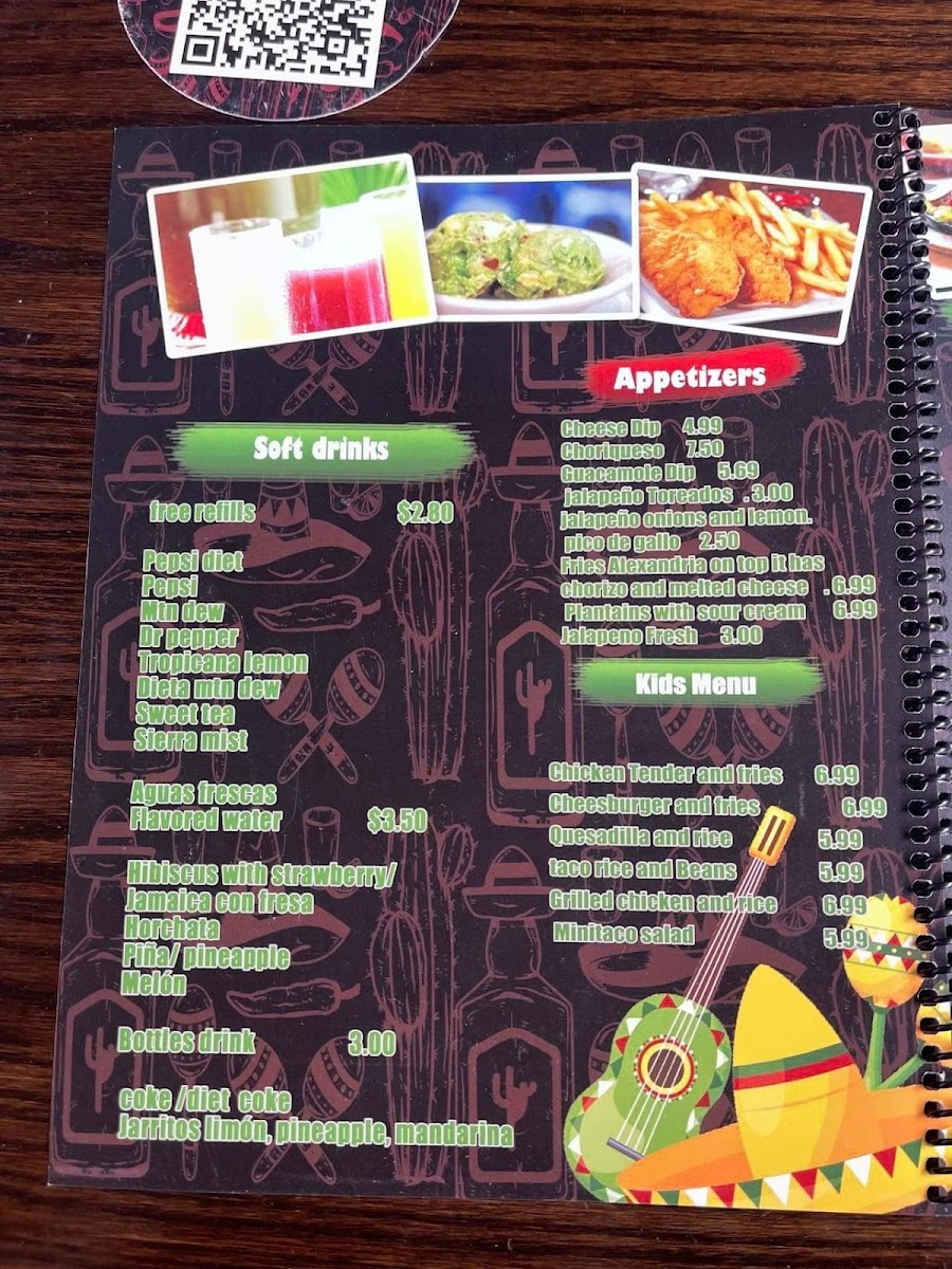 For the kids, there’s a variety of satisfying options including Chicken Tender & Fries, Cheeseburger & Fries, and Grilled Chicken & Rice. If you're in the mood for tacos, enjoy hearty choices like Asada/Steak, Al Pastor/Pork with Pineapple, or the spicy Chorizo/Mexican Sausage. Vegetarians can indulge in dishes such as the Mushroom Quesadilla or the Bean Burrito with Cheese & Grilled Vegetables.