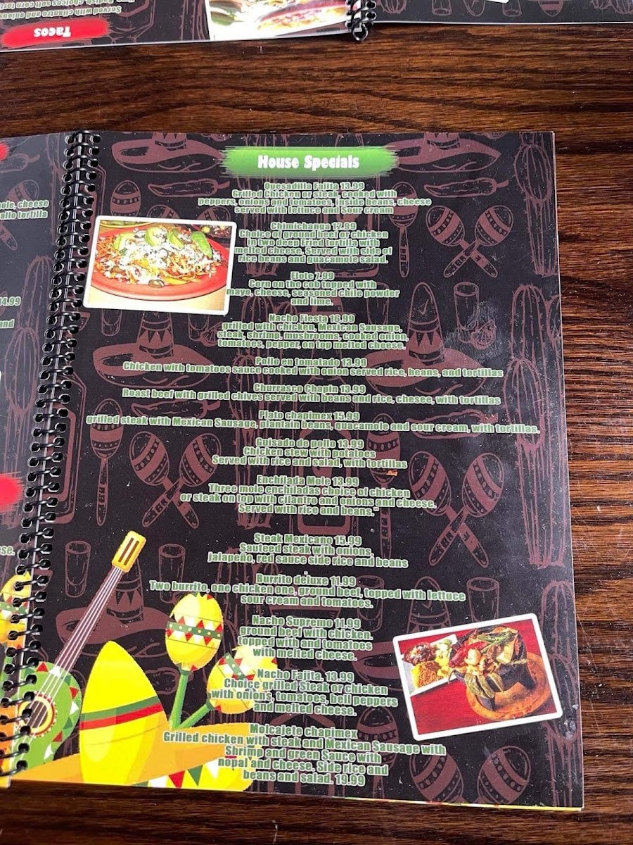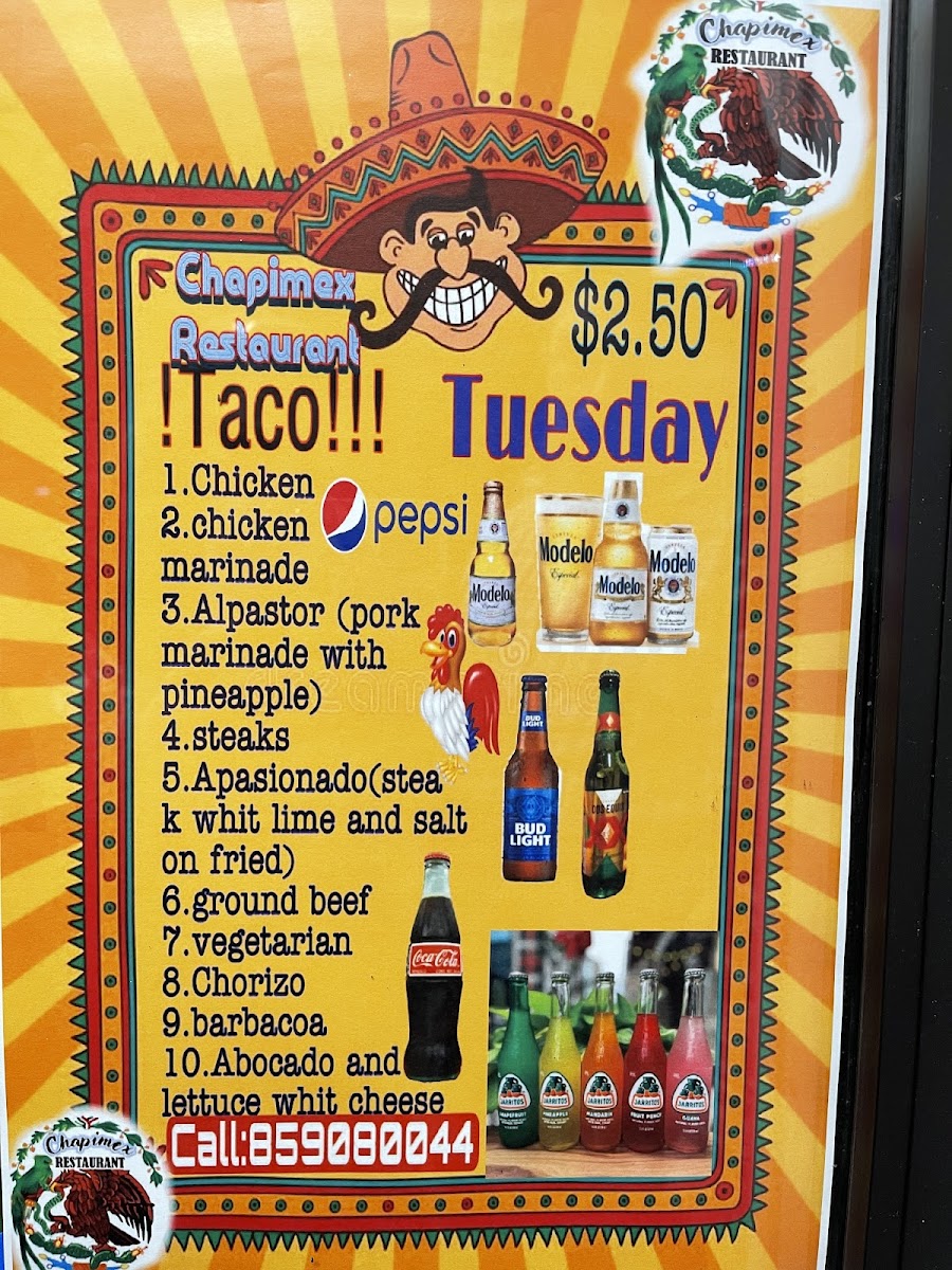 Chapimex Mexican Restaurant & Grill offers a vibrant and diverse menu perfect for any craving. Whether you're stopping by for lunch or dining all day, there's something for everyone. For a refreshing drink, they offer Diet Pepsi, Pepsi, Mountain Dew, Dr. Pepper, and Tropicana Lemon. Start your meal with appetizers like the creamy Cheese Dip, the flavorful Choriqueso, or the zesty Guacamole Dip.